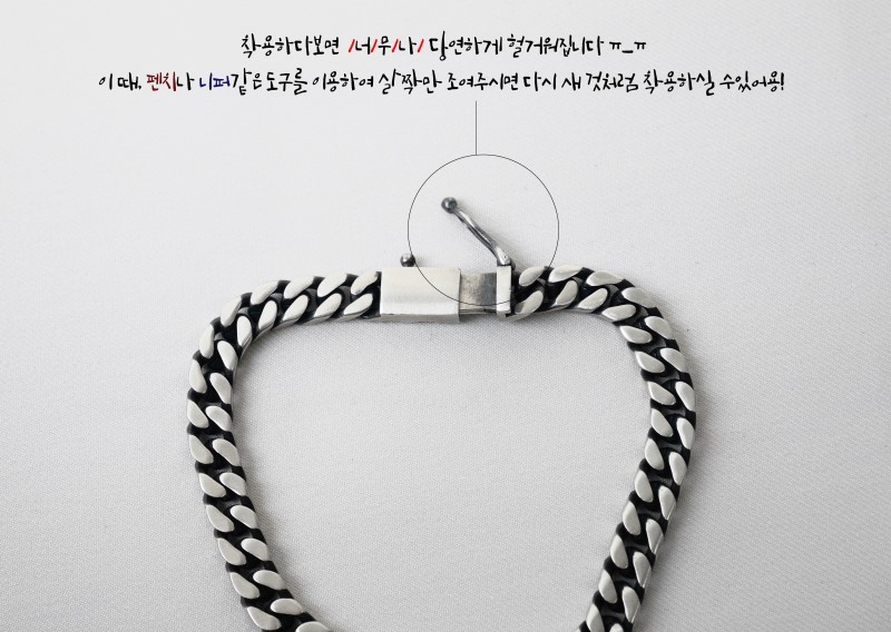 실버 체인팔찌 착용 후 무리한 스포츠 활동, 바닥에 던지거나 떨어뜨리는 행위 등 팔찌에 무리가 갈만한 일은 만들지 않는게 좋습니다.